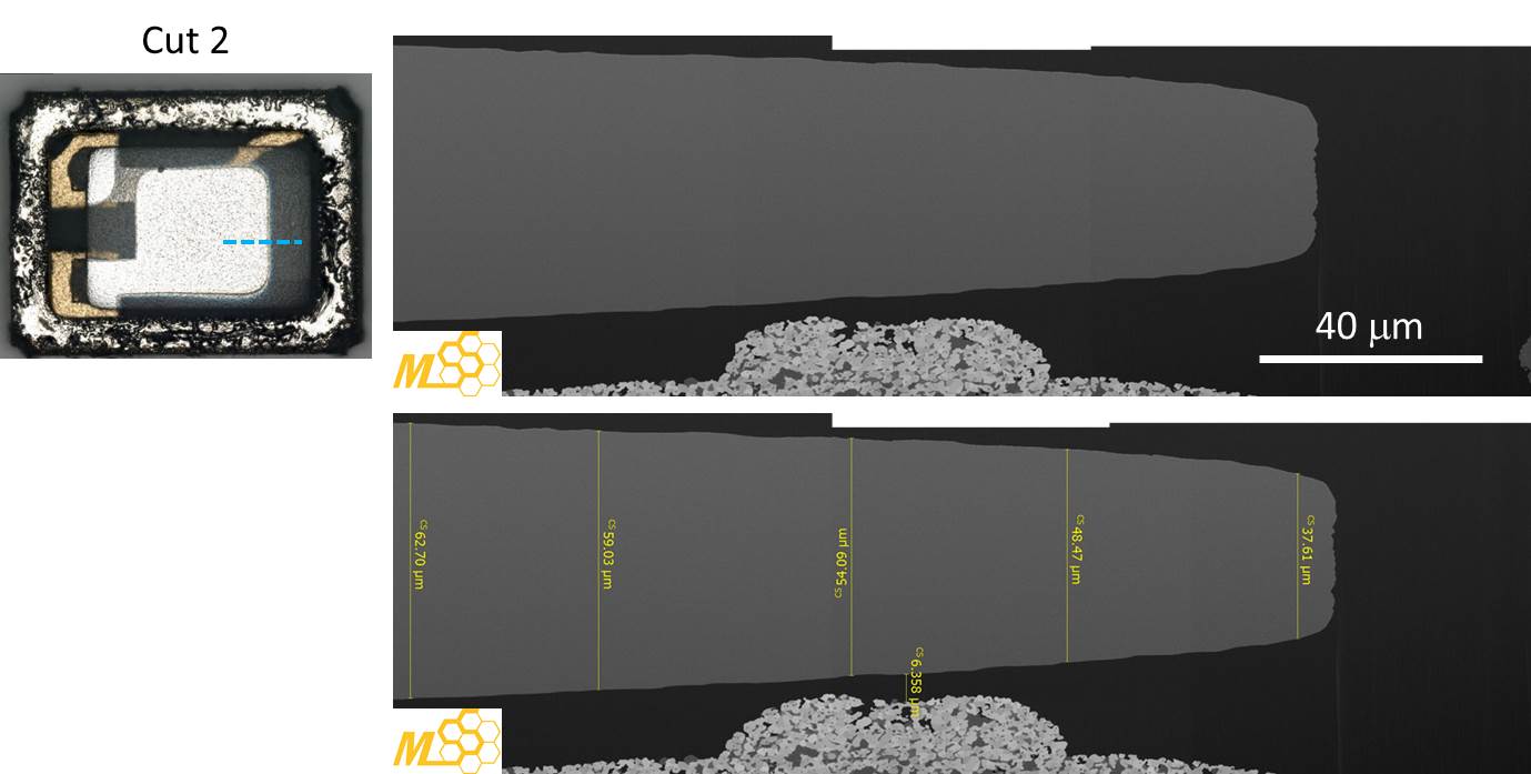 图3与4分别清楚呈现Cut 1与Cut 2的PFIB结果,相关的尺寸也都标示在图中。另外,由这两张图我们也可以清楚看到,即使石英晶体的尺寸相当大,但仍有些细微的结构是需要更高阶的分析设备(如TEM)才能解析出来的,例如石英晶体的晶格结构、金属薄膜的厚度与化学组成、银胶与封装基材的材料分析、甚至应力分析…等等,我们都将在下一份报告中呈现给读者。
