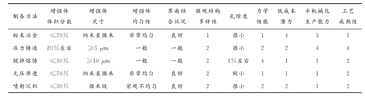 表:碳化硅颗粒增强铝基复合材料制备方法的特点