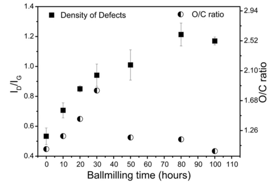 石墨烯中缺陷密度和氧化石墨烯氧化度随球磨时间的变化
