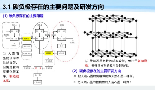 市场上主流负极石墨产品主要是天然石墨与人造石墨两大类。据周向阳教授介绍,碳负极存在的主要问题:(1)天然石墨的成本较低,但是由于各向异性,该材料的应用受限。(2)人造石墨的倍率等性能良好,但是需要造粒与石墨化等工序(具体步骤比如:粗粉/细粉、球化包裹、焦油处理),整体算下来制造成本高。
