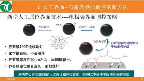 人工表界面技术目前已经有很多种方法,但是都是物理表面的保护,是惰性保护层。苏州大学的郑洪河教授另辟新径,通过表面处理、功能分子嫁接、功能分子转化、形成连续均匀的单分子纳米保护层、发展了具有电活性的纳米可调控界面。这种人工原位技术的优势,解决电极界面SEI膜的人工设计和原位转化,突破EC电解液电解液体系的局限。