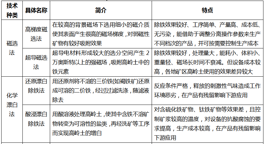 白度是高岭土产品最重要的指标,铁含量越高的矿产品烧成白度就越低,发展除铁技术,提高高岭土产品白度成为行业的必然发展趋势。除铁技术包括磁选法、化学漂白法、浮选法、氧化法、微生物法等多种技术。其中,磁选法是除铁技术最主要发展方向,铁元素在高岭土中主要有多种形式存在,各个矿区高岭土原矿中铁元素的存在形式差异较大,在实际除铁过程中,需要针对不同情况制定具有针对性除铁方案,才能提高除铁效果。磁选除铁已经发展出高梯度磁选、超导磁选等技术。