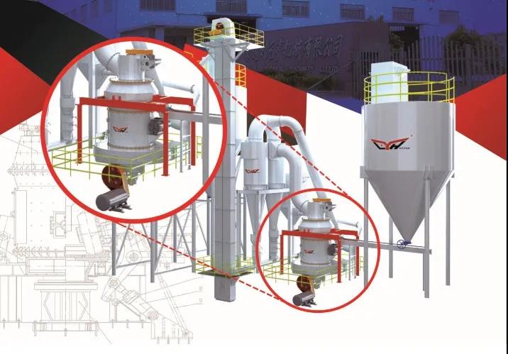 大该系列磨粉机整套设备由主机、选粉机、风机、颚破、畚斗提升机、电磁振动给料机、储料仓、气箱脉冲收尘器、管道装置、旋风集粉器、电控柜、电机等组成。