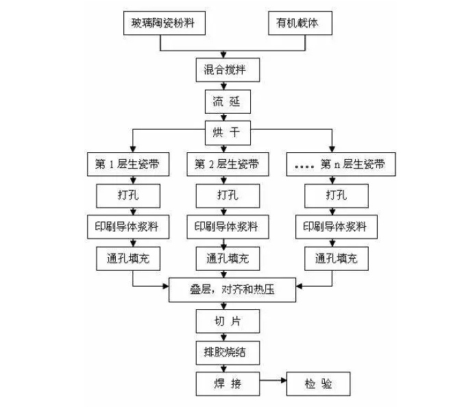 LTCC工艺流程大致步骤为:粉料制备—浆料配制—流延—切片—通孔成型—通孔填充—印刷—叠层—层压—排胶—烧结—检测。其详细工艺流程图如下: