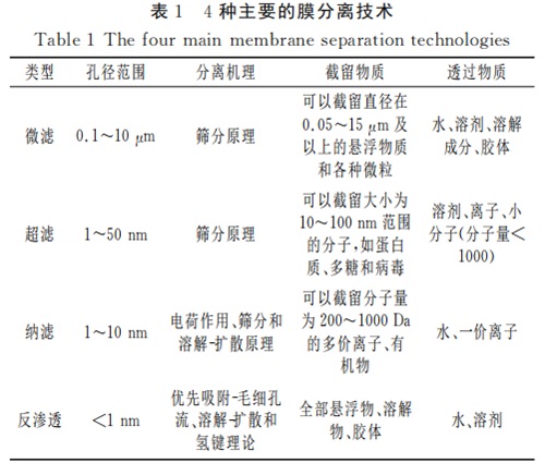 膜分离技术,顾名思义是通过膜使溶液中各组分进行分离、纯化或浓缩。膜过滤的操作条件较为温和,整个操作过程可实现机械化、自动化,且分离效率非常高。从分子水平即孔径大小上,分离膜可分为微滤膜(MF)、超滤膜(UF)、纳滤膜(NF)、反渗透膜(RO),它们各自的孔径范围、分离机理、推动力以及截留物质等见表1。