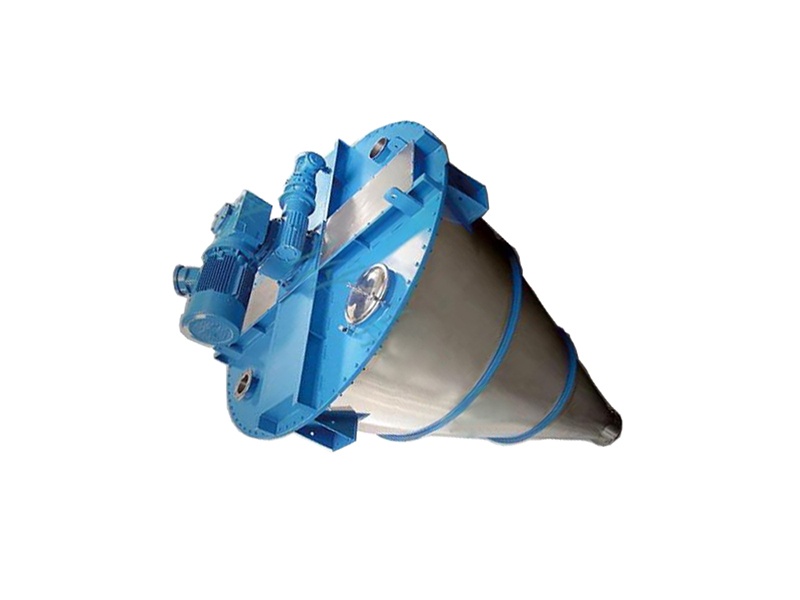 双螺旋锥形混合机(双螺旋混合机)的搅拌部件为两条不对称悬臂(转臂);不同长度,它们环绕锥形容器的中心轴轴线转动(公转)的同时,还借助转臂下方两根螺旋做自z运动;该设备通过悬臂与螺旋的公、自转使物料反复提升实现混合目的。