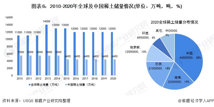 我国是全球最大的稀土储备国,2020年全球稀土储备量为1.2亿吨(以稀土氧化物REO计),而我国稀土储量为4400万吨,占比超过全球三分之一。