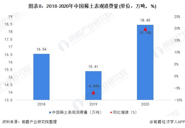 稀土作为“现代工业维生素”,其应用范围非常广泛。伴随着我国现代工业不断发展,我国对稀土的需求日益扩大。2018-2020年,我国稀土表观消费量在15万吨以上。2020年,我国稀土表观消费量更是高达18.45万吨。
