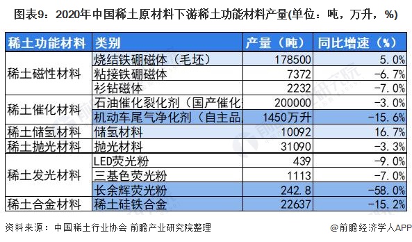 稀土下游需求主要为稀土磁性材料、稀土催化材料、稀土储氢材料、稀土抛光材料、稀土发光材料、稀土合金材料等稀土功能材料。目前稀土磁性材料对稀土原材料需求最大,2020年稀土磁性材料产量超过20万吨。