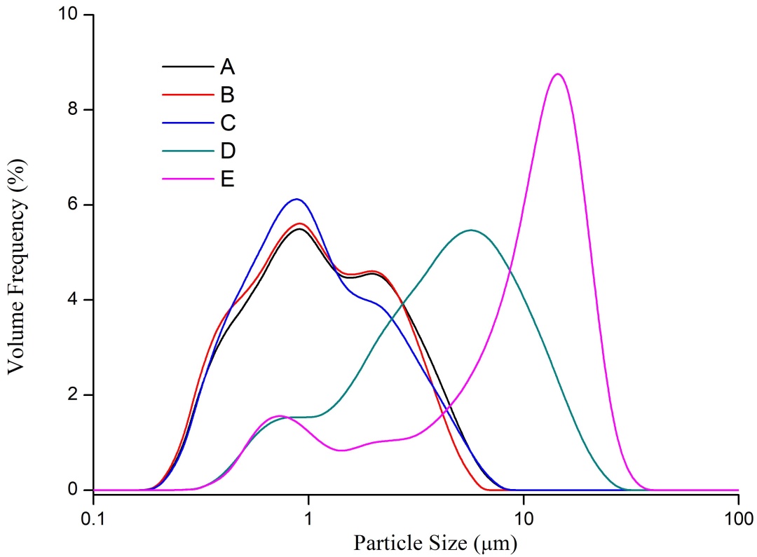 常用的锂离子电池正极材料有磷酸铁锂、钴酸锂、碳酸锂和高镍三元材料等,它们的粒径分布是影响电池性能的关键因素,其粒度分布可优化锂电池的能量和功率。实验室采用Bettersize2600激光粒度仪检测了5种磷酸铁锂样品,它们的粒度分布如下: