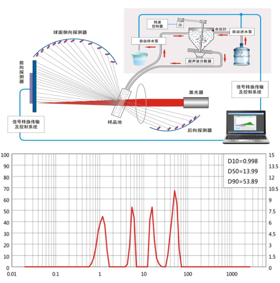 中国粉体网讯 激光粒度仪是通过颗粒的衍射或散射光的空间分布(散射谱)来分析颗粒大小的仪器,采用Furanhofer衍射及Mie散射理论,测试过程不受温度变化、介质黏度、试样密度及表面状态等诸多因素的影响,主要将待测样均匀地展现于激光束中,即可获得准确的测试结果。