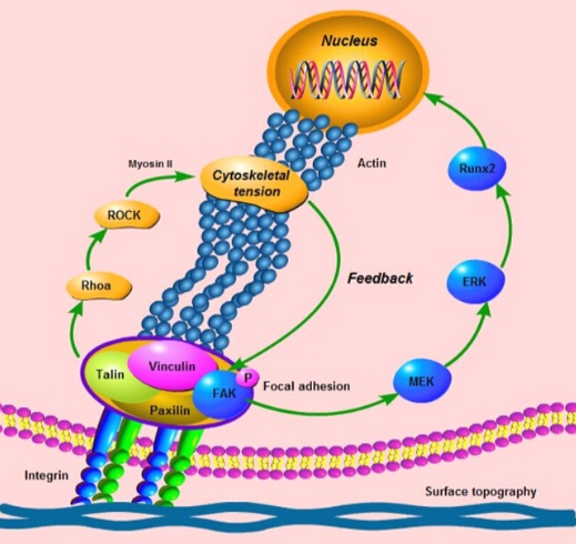 在纳米尺度的设计方面,制备了具有纳米线表面结构的钛涂层,该类涂层有利于体液中血清蛋白在其表面吸附,从而促进成骨细胞的粘附、增殖和分化;研究结果显示,该类涂层通过活化Integrin β1/ROCK/FAK/ERK信号通路而诱导间充质干细胞向成骨细胞分化。