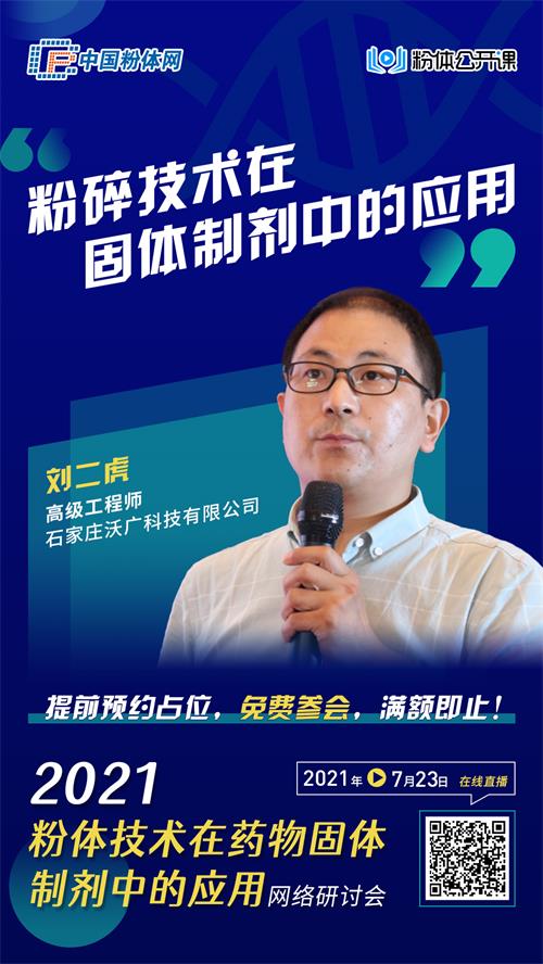 为探讨固体制剂制药过程中,粉体技术对药物质量及生产工艺的影响,中国粉体网旗下粉体公开课平台将于2021年7月23日举办“2021粉体技术在药物固体制剂中的应用网络研讨会”,届时来自石家庄沃广科技有限公司的刘二虎高级工程师将作《粉碎技术在固体制剂中的应用》报告,讲述固体制剂工艺过程中,粉体技术的应用对质量控制及生产过程等方面的提升,粉体技术带动制药工业向高质量方向发展。