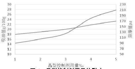 碳化反应包括碳酸钙晶核的生成和晶体的长大,在碳化反应初期,随着晶型控制剂用量的增加,成核速率大于成长速率,制得的纳米碳酸钙粒径小,比表面积大,屈服值高,但吸油值也相应升高。