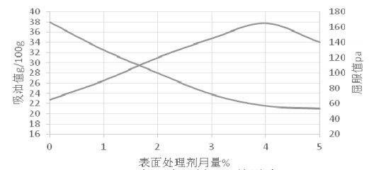 随着表面处理剂用量的增大,纳米碳酸钙的吸油值不断下降。但当处理剂用量增加到一定程度后,吸油值几乎不再下降,而且体系中过量的处理剂导致屈服值降低。