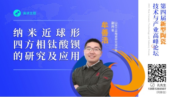 中国粉体网将在郑州举办“2021第四届新型陶瓷技术与产业高峰论坛”。届时,来自山东工业陶瓷研究设计院功能陶瓷研究所的牟善浩副所长带来题为《纳米近球形四方相钛酸钡的研究及应用》的报告。(鉴于当前防控需要,原定于2021年8月13-14日在郑州喆鹏酒店举办的“第四届新型陶瓷技术与产业高峰论坛”将延期举办,计划参会的单位可以联系会务组,具体举办日期主办方确定后将第一时间通知您)。