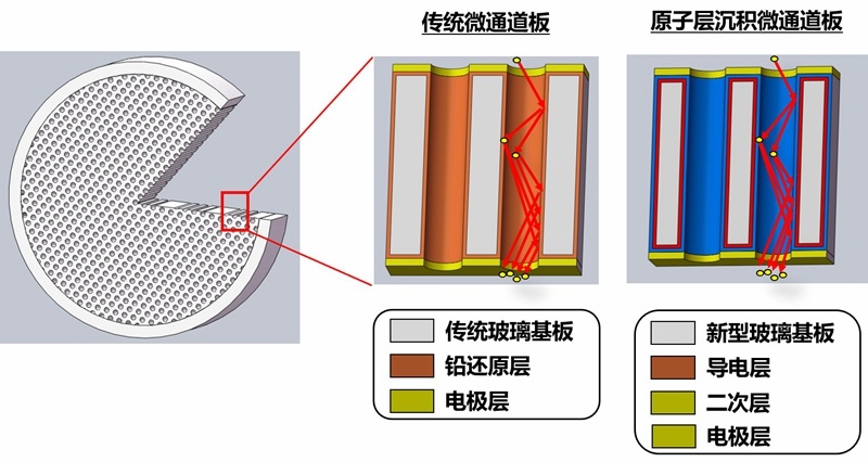 微通道板是一种在单通道电子倍增器基础上发展起来的具有多通道连续倍增极结构的电子倍增器件,因其独特的增益、噪声、空间分辨、时间分辨特性,成为光子、电子、离子探测和图像增强/微弱光信号放大中的核心器件。联合团队利用ALD技术在微通道内壁沉积导电层和二次电子发射层功能材料,实现了结构材料和功能材料的分离,避免了传统铅玻璃氢还原工艺中材料与性能相互牵扯的矛盾,基体材料可扩展到硼硅酸盐玻璃材料、高分子材料以及陶瓷材料等。该技术采用微电子工艺,工艺重复性高,产品性能稳定可靠,且可沉积更高二次电子发射系数材料,不含RoHS限制物质,具有噪声低、增益高、寿命长、可实现更大面阵探测器件等独特优点。