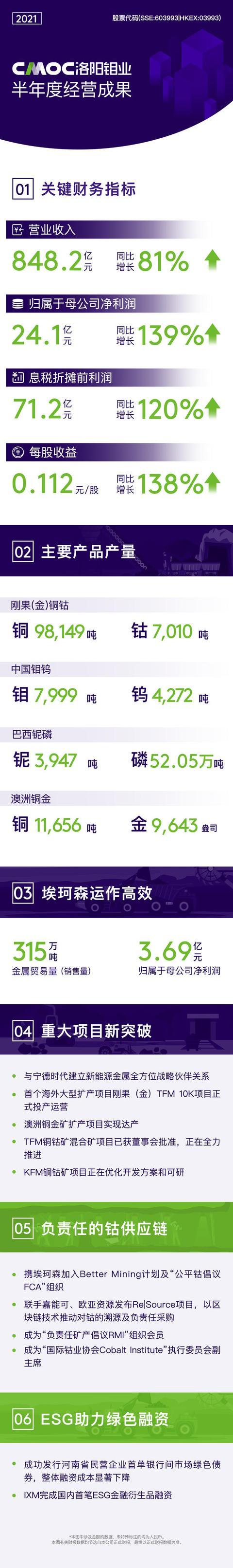 中国粉体网讯 8月22日,洛阳栾川钼业集团股份有限公司(SH.603993,简称“洛阳钼业”)发布2021年半年财务报告显示,公司的铜、钴、钼等主要金属产量进一步提升。同时受益于全球大宗商品的价格上涨,公司的业绩同比显著增长,实现主营业务收入848.2亿元人民币,同比增长81%;归属于母公司净利润24.1 亿元,同比增长139%,创2019年以来的新高。