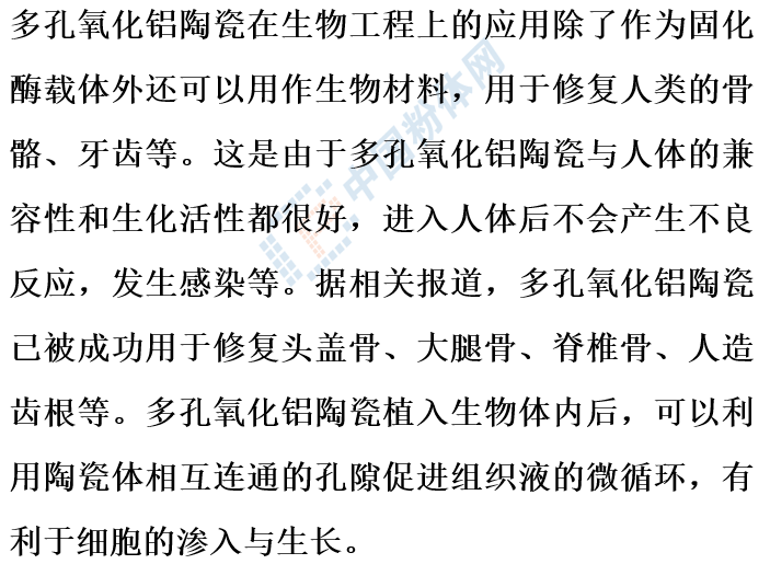 多孔氧化铝陶瓷可以被用作固体酶载体,有利于生化反应速率的提升。山东铝研究院制备的多孔氧化铝陶瓷,在用作固体酶载体时,可使固定酶活达到每克氧化铝具有8000-1000个单位,大大突破了最低要求每克氧化铝7000个单位的固定酶活。
