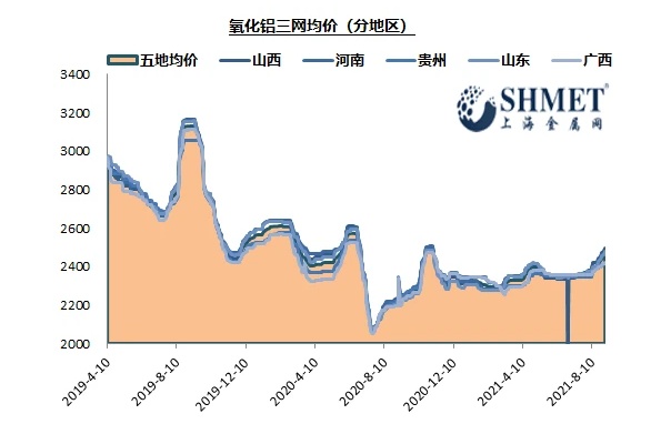 中国粉体网讯 近日有消息称,在广西政府召开的全区坚决遏制“两高”项目盲目发展暨能耗双控工作电视电话会议上提出,政府要求,9月区域内所有氧化铝及电解铝行业分别压产50%-80%。此后有消息称,广西地区涉及的6家氧化铝企业,在9月产量不得超过2021年上半年月均产量的50%,9月用电负荷不得超过2021年上半年月均用电负荷的50%,经测算预计广西地区氧化铝厂9月产量将下降超40万吨。在消息传出至今的2-3天时间内,国内氧化铝现货价格急速上涨,山西、河南、广西、山东和贵州地区均价单日最高增幅分别为82元/吨,98元/吨,145元/吨,77元/吨和160元/吨。另外,截止今日,山西、河南、山东地区均价已超3000元/吨,为2019年7月以来最高水平。