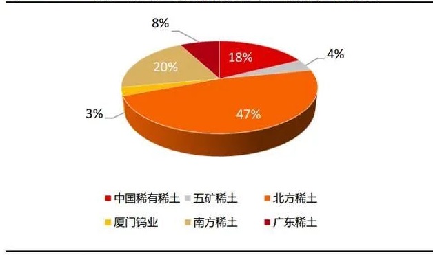 目前国内稀土开采指标集中在六大稀土集团手中。工信部2017年牵头制定了稀 土大集团组建方案,将国内的稀土资源和企业集中整合,共整合稀土矿山22家,冶炼分离企业54家,最终形成六大稀土集团。包括北方的北方稀土,重点覆盖内蒙古自治区和甘肃的稀土资源与企业,主要产品以轻稀土为主;南方的南方稀土、中国铝业(中国稀有稀土股份有限公司)、五矿稀土、厦门钨业、广东稀土,重点覆盖江西、湖南、广东、福建、云南、广西、江苏、山东、四川等地的稀土资源与企业,主要产品以重稀土为主。