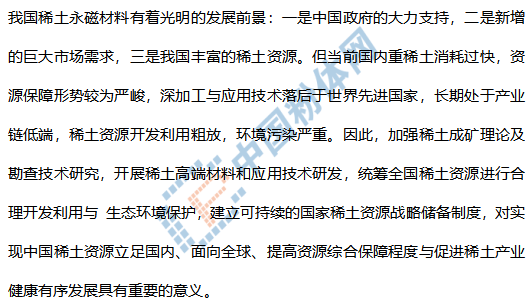 凭借稀土资源优势,我国已经在稀土永磁电机方面建立起了完整的产业链及完善的产业生态系统。相比欧美国家,我国自主研发的稀土永磁电机在原材料和生产成本都具有明显优势,但是在电机设计和高端特种电机研发生产方面存在差距。因此,稀土永磁电机的研究开发和应用普及推广必须得到国家的大力支持。未来随着各国对新能源和节能环保项目的大力推动,稀土永磁电机在新能源汽车的用量还将持续增长,稀土永磁电机未来广阔的应用前景也会带来巨大的市场前景。