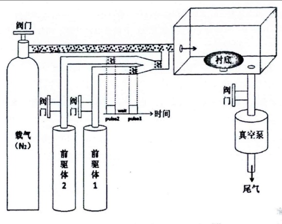 原子层沉积技术使用气相的反应物,通过控制气路系统,交替通入气相反应物(即前驱体)到反应室中,在基底表面发生化学反应,由反应进行的周期数控制沉积层数,一层一层的沉积。利用反应物表面反应的自饱和性和不可逆性,使得每次只在表面吸附上一层前驱体,从而实现原子层尺度可控的薄膜沉积。