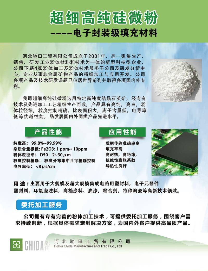 河北驰田工贸有限公司创立于2001年,专业从事非金属矿物的科研开发及生产加工,已通过ISO90001国际质量管理体系认证。我司利用专有技术及先进加工工艺生产超细高纯石英粉,产品具有纯度高,白度高,粒度控制精确,低离子含量,低电导率等优越性能,广泛用于高端电子封装、硅橡胶、光学玻璃及特种陶瓷等高科技领域。