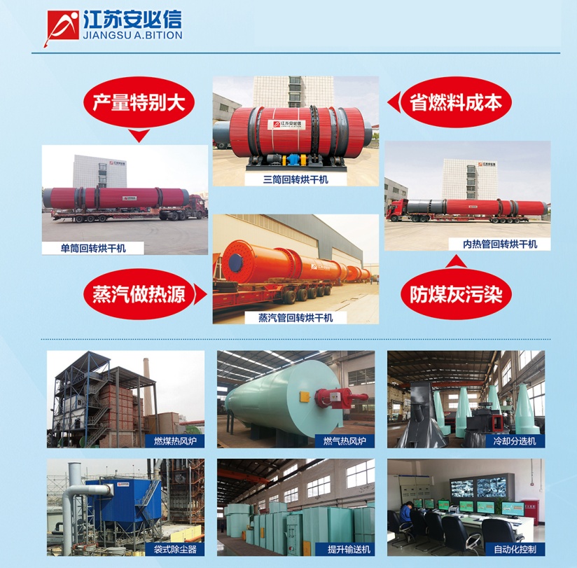 江苏安必信生产的石英砂烘干机制作精良,性能稳定、工艺、产量高、能耗低、占地面积小、机械化程度高。