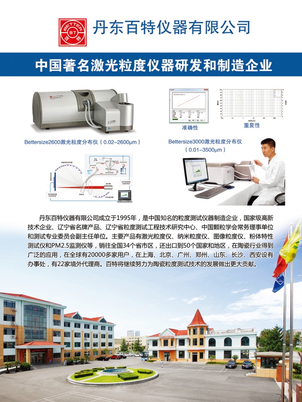 丹东百特仪器有限公司成立于1995年,是中国知名的粒度测试仪器制造企业,国家级高新技术企业、辽宁省名牌产品、辽宁省粒度测试工程技术研究中心、中国颗粒学会常务理事单位和测试专业委员会副主任单位。主要产品有激光粒度仪、纳米粒度仪、图像粒度仪、粉体特性测试仪和PM2.5监测仪等,销往全国34个省市区,还出口到50个国家和地区,在陶瓷行业得到广泛的应用,在全球有20000多家用户,在上海、北京、广州、郑州、山东、长沙、西安设有办事处,有22家境外代理商。百特将继续努力为陶瓷粒度测试技术的发展做出更大贡献。