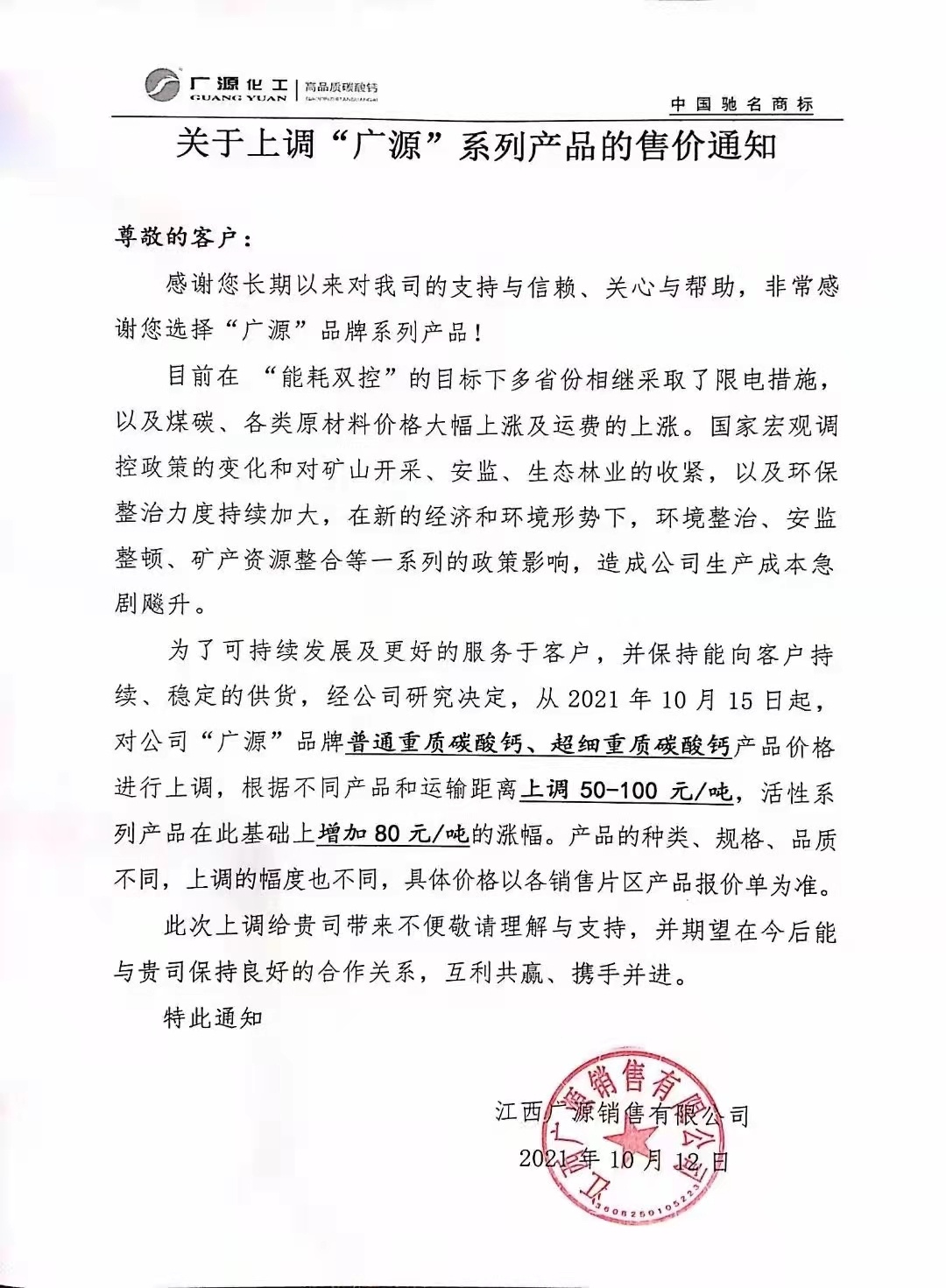 受限电煤炭各类原材料大幅上涨以及运费成本提高,从2021年10月15日起江西广源品牌普通重质碳酸钙、超细重质碳酸钙产品价格上调50-100元/吨,活化系列产品在基础上上调80元/吨涨幅!