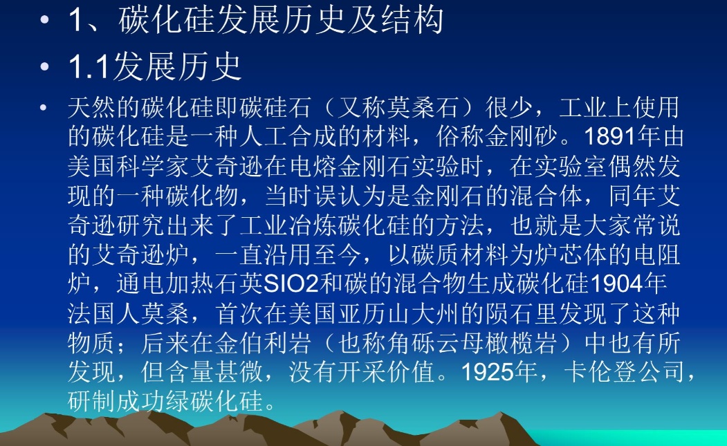 河南磨岳工业设计有限公司总经理毋水鑫先生给大家带来了题为《碳化硅基础常识及市场发展分析》的报告,毋总的报告分为四个部分,首先,毋总详细的介绍了碳化硅发展历史及结构特征,并分别分析了目前国内黑碳化硅和绿碳化硅的市场空间。