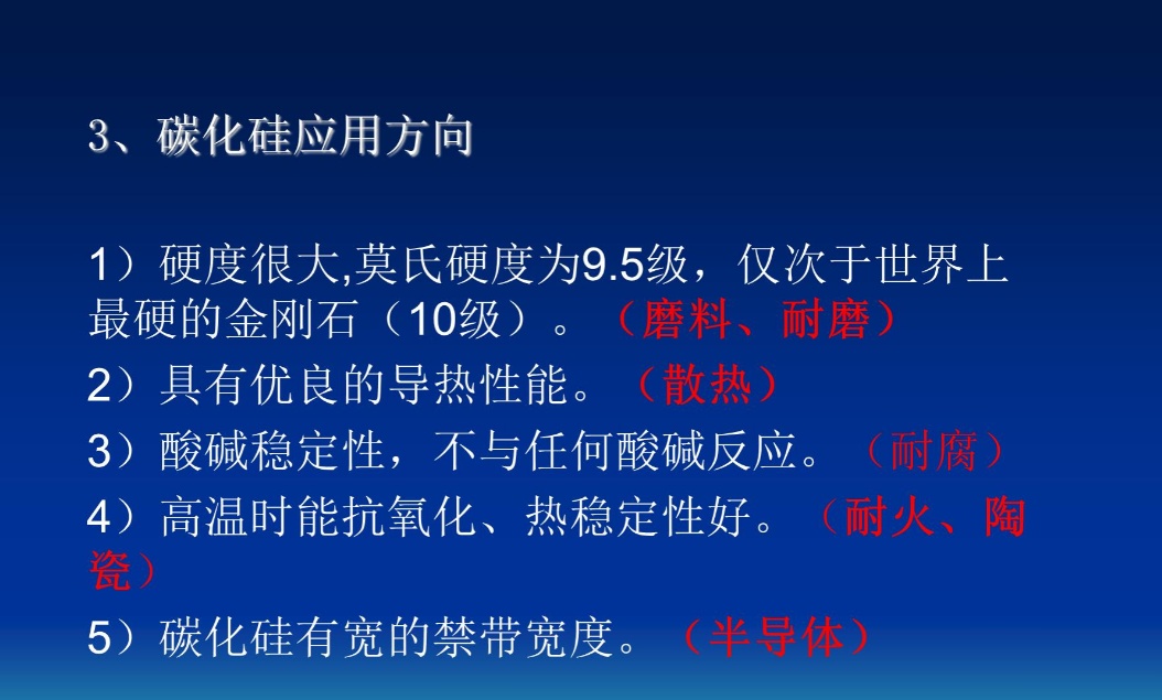 接下来,从毋总的报告中我们可以了解到,碳化硅具有以下特点及应用领域:
