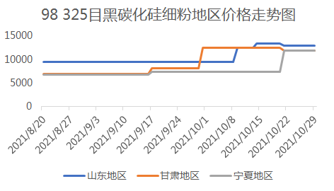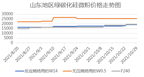 从报告中我们了解到,截止至发稿,山东地区绿碳化硅微粉系列的反应烧结用的W14、W10的主流价格在17000-19000元/吨,另外无压烧结用的W0.5的主流价格在25500元/吨,F240的主流价格在18000-19500元/吨。山东、甘肃地区黑碳化硅细粉磨料用98 325目主流价格是11000-13000元/吨。山东地区重结晶碳化硅用Rs07主流价格在28000元/吨。