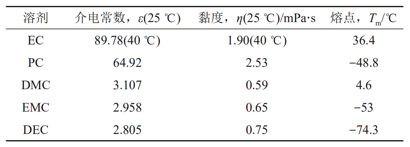 碳酸酯作为一类常用的钠离子电池有机电解液溶剂,通常具有较强的溶盐能力。钠离子电池常用的碳酸酯溶剂主要有:碳酸乙烯酯(EC)、碳酸丙烯酯(PC)、碳酸二乙酯(DEC)、碳酸二甲酯(DMC)等,其物理化学性质见表。