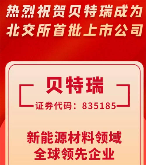 中国粉体网讯 11月15日,北交所正式开市,81家公司成为北交所首批上市公司。有3家来自深圳,分别为首日上市新股广道高新,精选层平移公司贝特瑞和美之高。值得注意的是,新能源材料企业贝特瑞为北交所首批上市公司中市值最大的公司,截至11月12日收盘,贝特瑞总市值突破900亿元。营业收入超过10个亿的公司中,贝特瑞最高,营收为68.51亿元,净利润为10.9亿元,是北交所唯一一家净利润超10亿元公司。