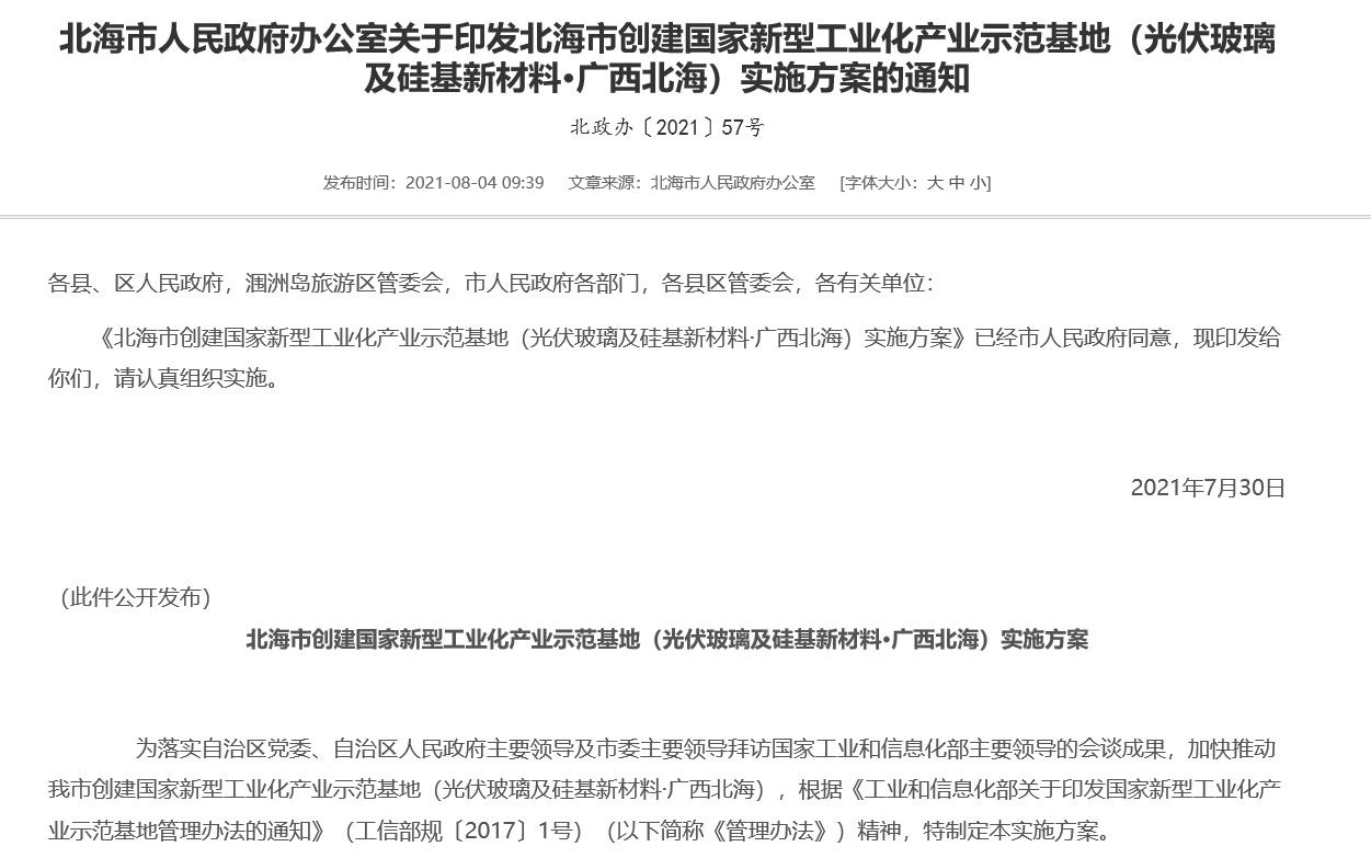 在今年8月,北海市人民政府还颁发了《北海市人民政府办公室关于印发北海市创建国家新型工业化产业示范基地(光伏玻璃及硅基新材料·广西北海)实施方案的通知》。通知中提到,光伏玻璃及硅基新材料产业基地为龙港新区铁山东港产业园及铁山港(临海)工业区玻璃产业园形成的产业聚集区。这进一步说明了,北海市对于打造硅科技与光伏玻璃产业链集群的重视与支持,中国粉体网小编在此也希望北海市早日建成全球最大的硅科技及光伏玻璃全产业链基地!