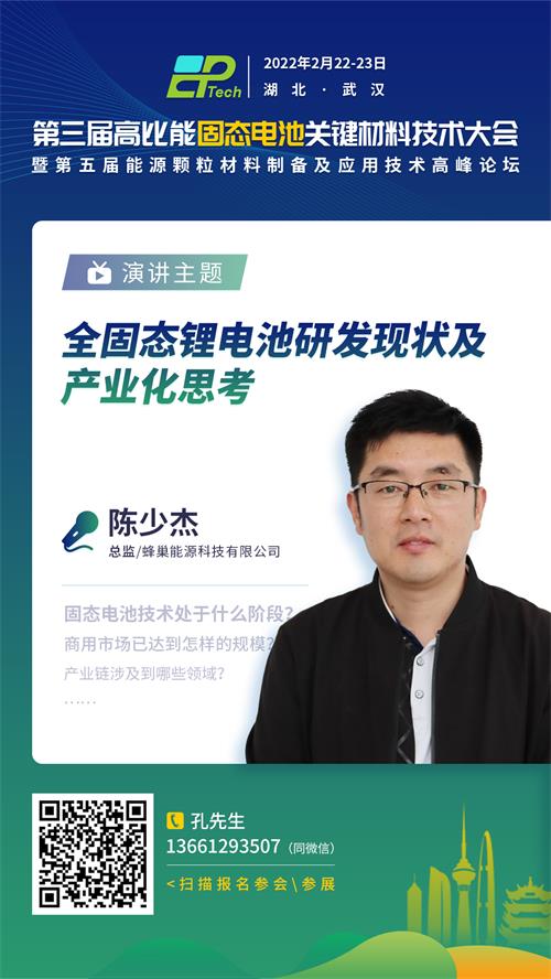 随着产品和技术的不断成熟,固态锂电池产业有望获得快速发展。2022年2月22-23日,由中国粉体网主办的“第三届高比能固态电池关键材料技术大会”将于湖北武汉东方建国大酒店举办,届时将邀请来自蜂巢能源科技有限公司的陈少杰研发总监作《全固态锂电池研发现状及产业化思考》报告。报告人将重点从当前全球范围内全固态锂电池相关区域及机构的研发现状,分析各个代表性研发机构的研发进展和技术路线;并就全固态锂电池的核心技术展开技术分析,对产业化所面临的挑战进行分析和思考;最后报告人将介绍蜂巢能源科技有限公司在全固态锂电池产业化推进中的研发进展。