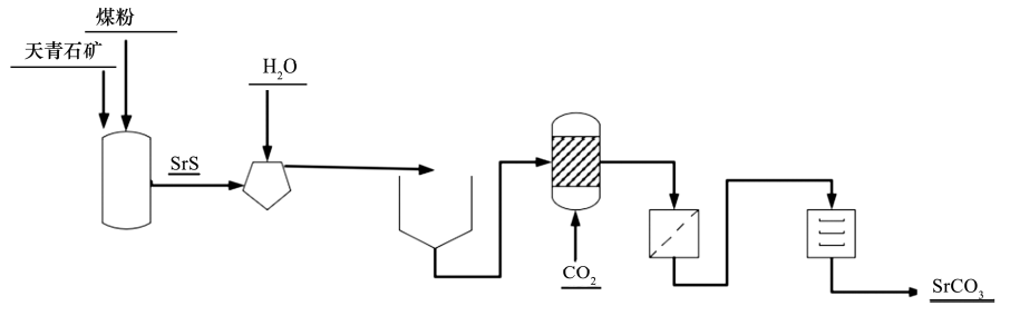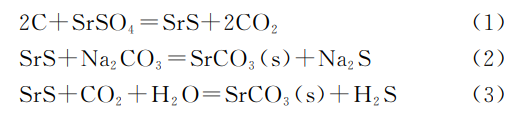 步骤(1)将细天青石矿与碳在约1000℃下还原反应生成硫化锶和二氧化碳(反应式1)。(2)所得硫化锶加入热水浸取,过滤后分离出固体杂质。(3)所得滤液为硫化锶溶液,加入碳酸钠(反应式2)或通入二氧化碳(反应式3)沉淀碳酸锶,离心分离干燥得到碳酸锶产品。