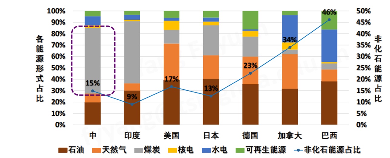 世界部分国家能源比例构成(来源:徐传伟.固体氧化物燃料电池及其产业化技术)