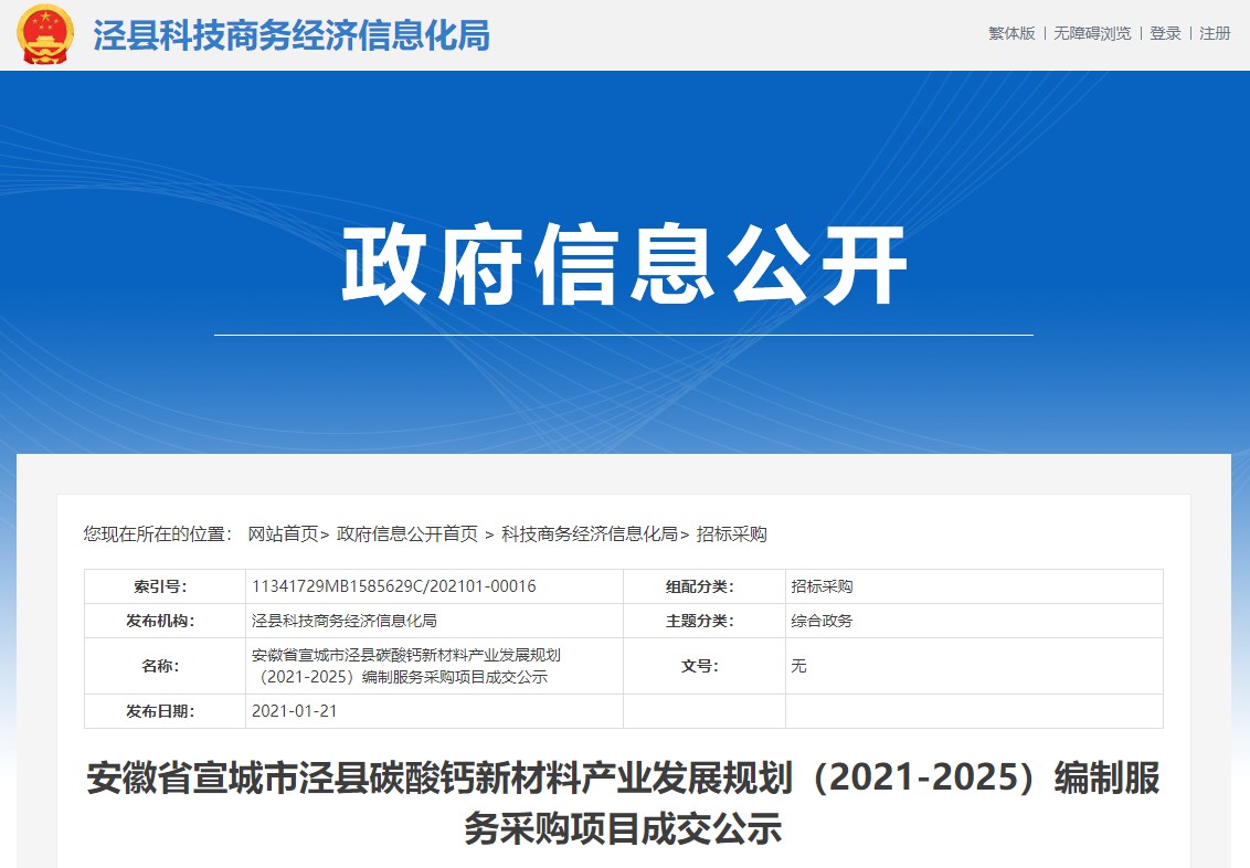 2021年1月21日,据泾县科技商务经济信息化局公示,安徽省宣城市泾县碳酸钙新材料产业发展规划(2021-2025)编制服务采购项目成交。2021年6月30日,安徽省宣城市泾县碳酸钙新材料产业发展规划(2021-2025)专家评审会在泾县召开,一致同意通过《规划》评审,并建议尽快安排规划方案的落地实施。