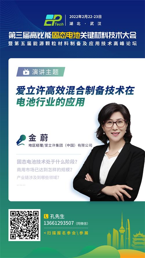 为推动锂电制备技术行业交流,2022年2月22-23日,由中国粉体网主办的“第三届高比能固态电池关键材料技术大会”将于湖北武汉东方建国大酒店举办,届时将邀请来自爱立许集团(中国)有限公司的地区经理金蔚女士作《爱立许高效混合制备技术在电池行业的应用》报告。报告主讲人将介绍爱立许高效混合技术在全固态电池的正极材料、电解质制备、锂电池前驱体和正极材料包覆、负极材料制备、锂电池浆料制备和高固含和纯干电极等领域,已取得的应用进展。