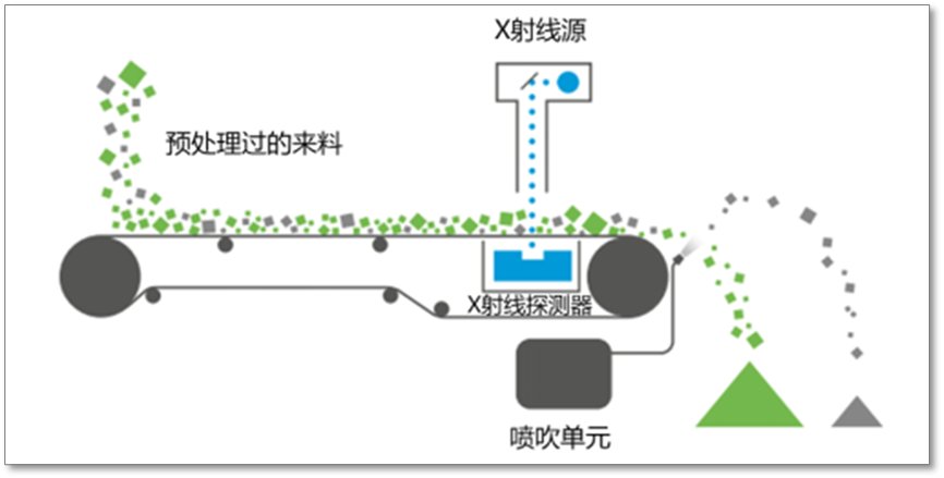 智能矿石预选抛废技术是根据矿石中不同颗粒密度、形状、厚度等物理特性的差异,通过X射线对颗粒进行逐一扫描后,形成不同灰度值的照片,系统根据图像识别矿石从而分选出目的矿物颗粒的一种选矿方法。该方法多用于矿石的破碎阶段,对有用矿物具有初步富集效果。发展智能预选抛废技术可以提高资源的综合利用率和提高入选矿石品位、减少矿石的入磨量和细粒尾矿的产出量,降低磨选成本、提升精矿品质,同时产生的废石还可用于建筑材料,能显著提高企业的经济效益和社会效益,改善环境状况、延长尾矿库的服务年限。