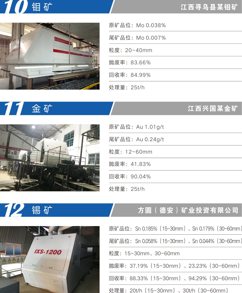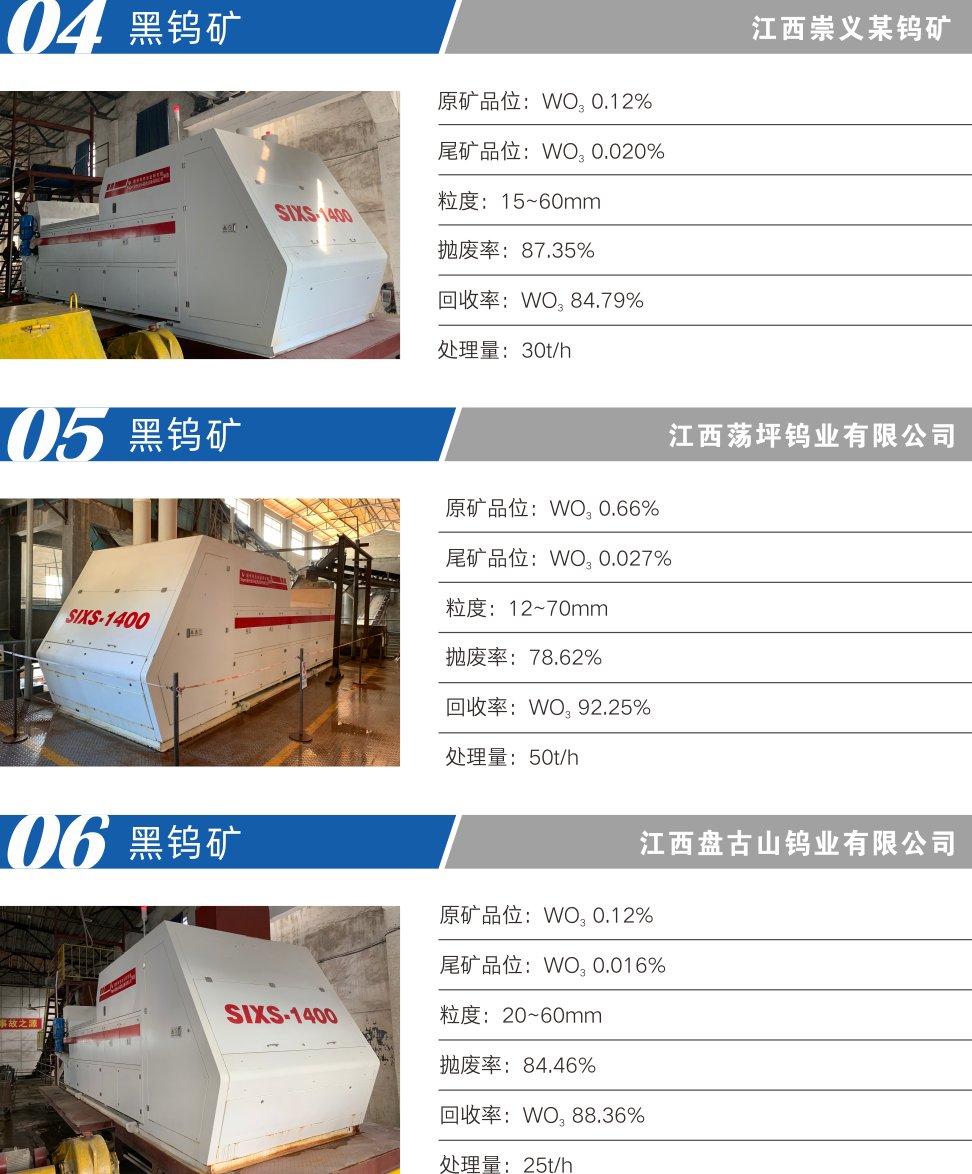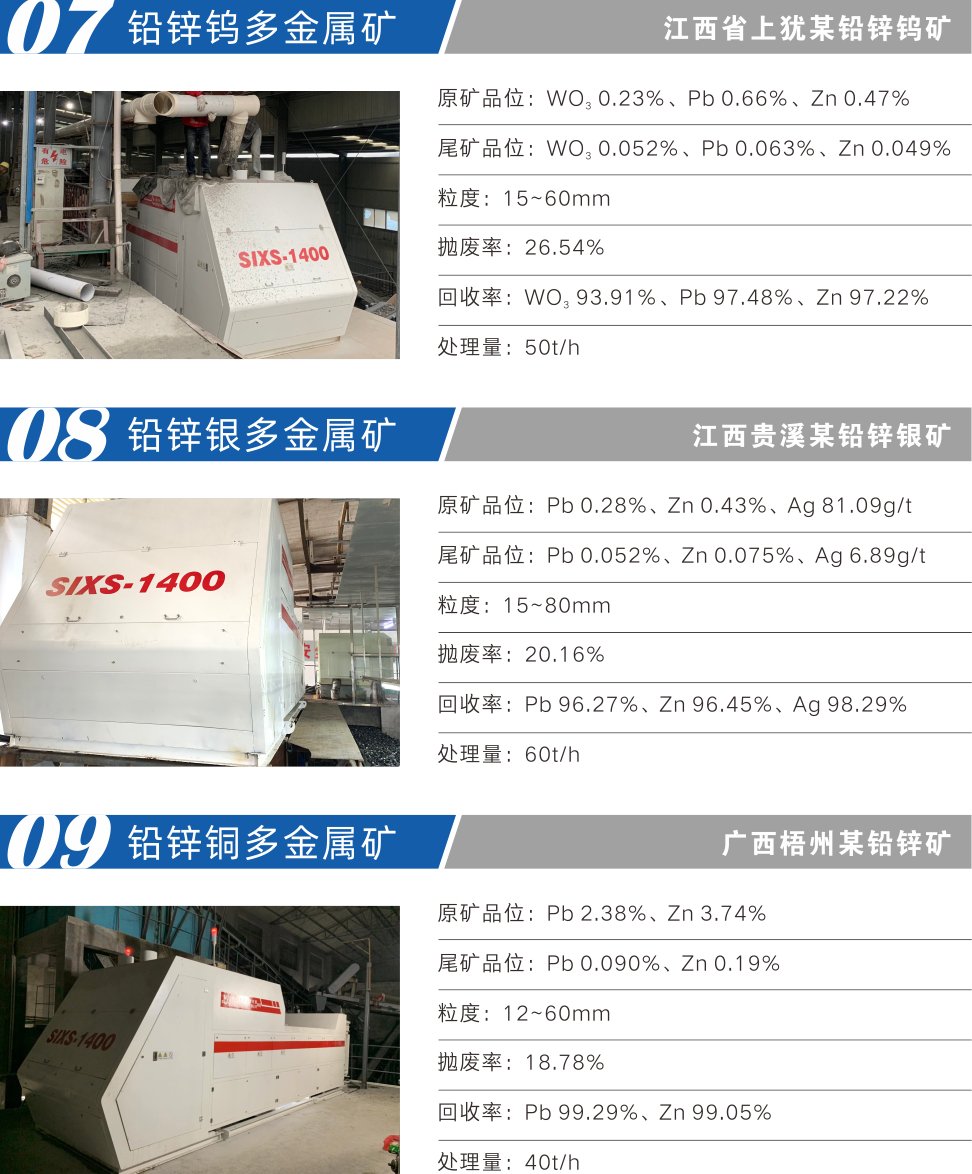 适用于钨矿、锑矿、锡矿、铅锌银矿、铜矿、金矿、钼矿等有色金属、贵金属、稀有金属矿以及长石、石英等非金属的预选抛尾工艺,替代人工手选作业、全磨全选,可大幅提高粗选抛废率,提高入磨品位,扩大产能,提质增效,降低选矿成本,实现矿山智能化生产。SIXS型装备可分选10-100mm粒级范围矿石,最大处理能力达240t/h。主要性能参数见表1。