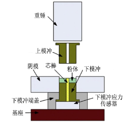 粉末高速压制技术是通过液压或重力等方式驱动重锤,以2~30m/s的速度冲击粉体,从而促使粉体在20ms内完成致密化过程的一种粉体压制成形技术,其相应高速压制设备原理见下图。