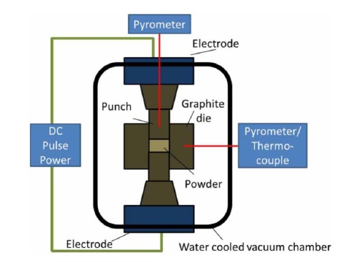 如上图所示,SPS致密化可以看作在脉冲电流作用下,粉末颗粒间放电、通电产生焦耳热和加压的叠加作用结果。除加热和加压这两个烧结因素外,粉末颗粒之间的表面放电可促使局部产生高温,使表面局部熔化;高温等离子体溅射和放电冲击可有效去除粉末颗粒表面杂质(如表面氧化物等)和气体吸附,这些因素均能促进烧结过程。