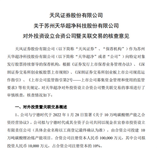 1、天华超净再度牵手宁德时代,合资投建10万吨碳酸锂