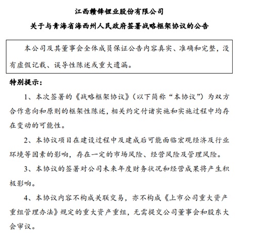 2、赣锋锂业与海西州人民政府签署战略框架协议