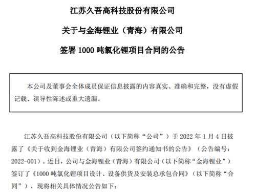 2022年1月4日,江苏久吾高科技股份有限公司披露了《关于收到金海锂业(青海)有限公司签约通知书的公告》。据悉,金海锂业系上市公司惠州亿纬锂能股份有限公司的控股子公司。