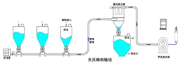 正压和负压也可进行组合应用以满足特殊要求,比较适用多点供料多点出料的输送方式以满足复杂的生产工艺要求。